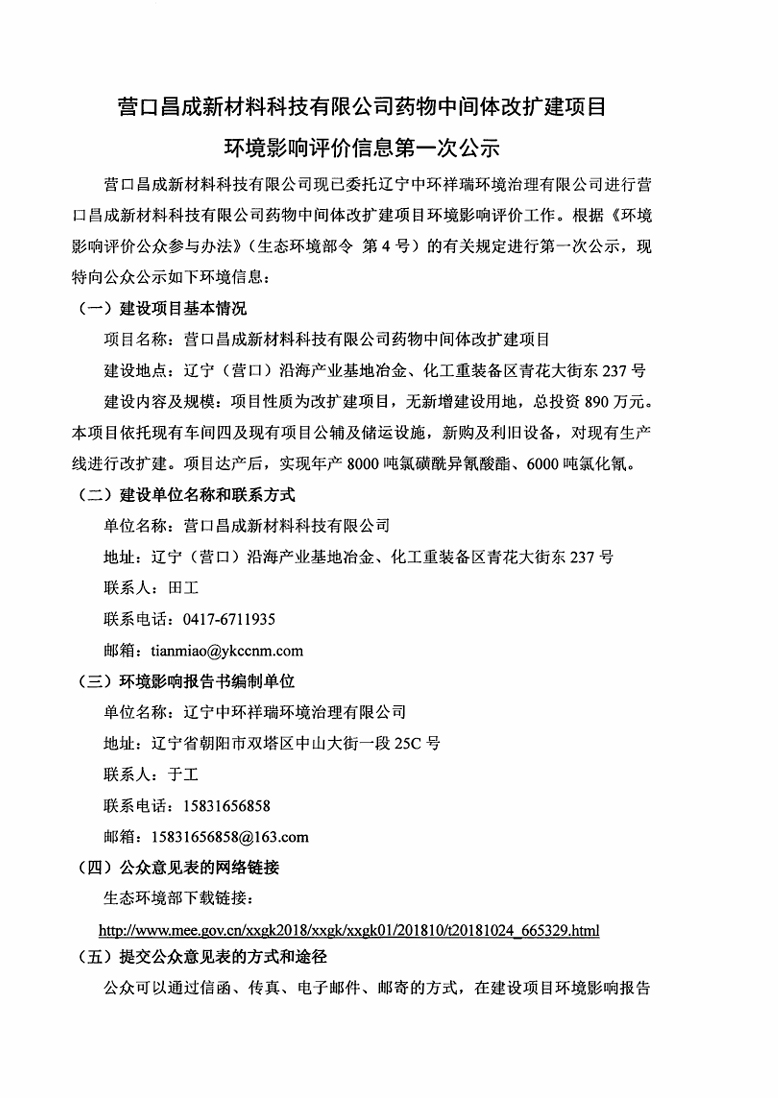 營口昌成新材料科技有限公司藥物中間體改擴(kuò)建項(xiàng)目環(huán)境影響評(píng)價(jià)信息第一次公示